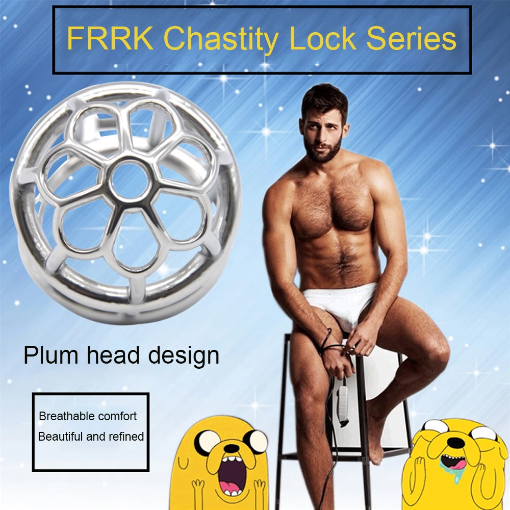Male Chastity Lock Plum Blossom Head Lengthened Cock Cage Sexual Goods Anti-derailment Masturbation Adult SM Chastity Steel